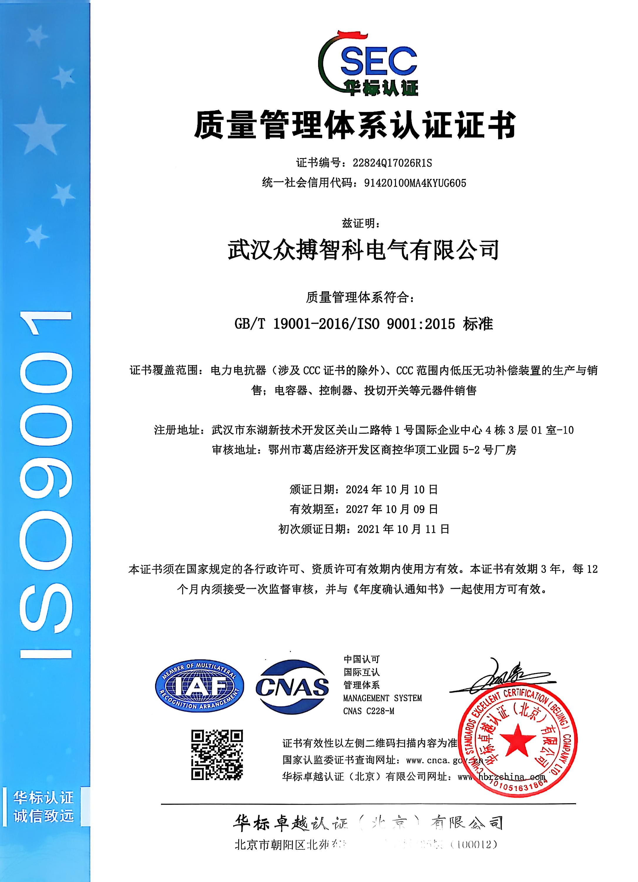 質(zhì)量管理體系認證證書(中文版)